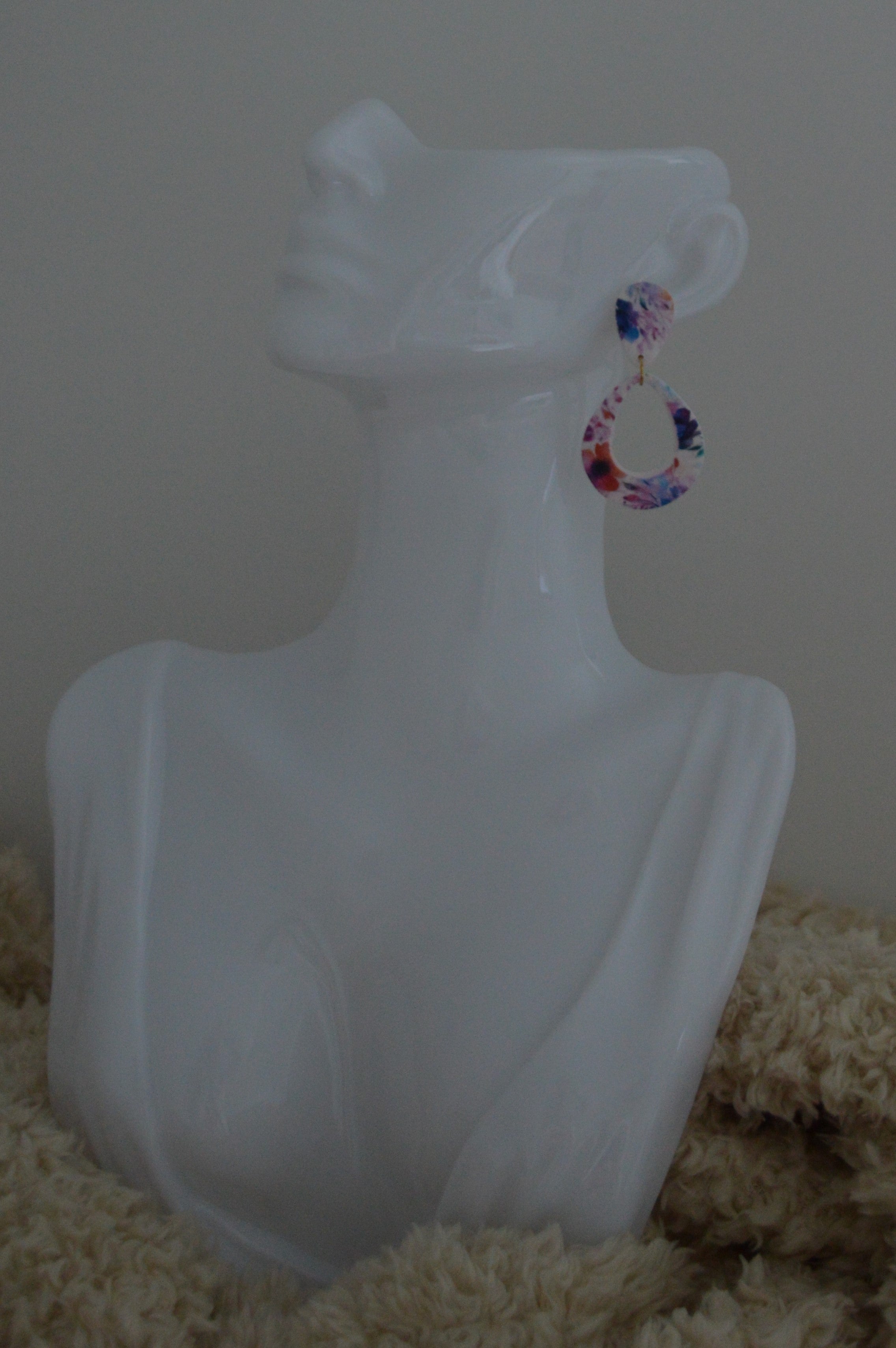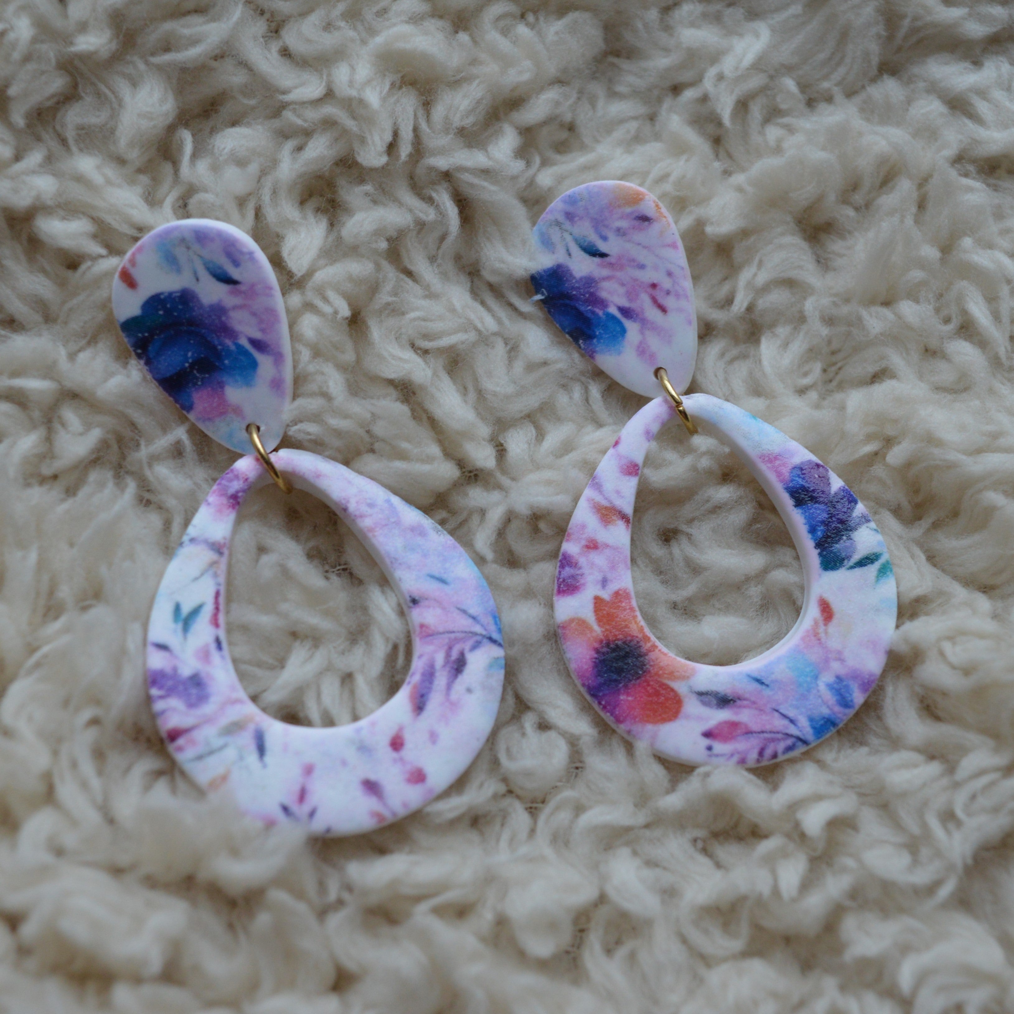 De Grace Loop – Floral Symphony combineert een elegante druppelvorm met een speels bloemenpatroon in paarse, roze en oranje tinten.