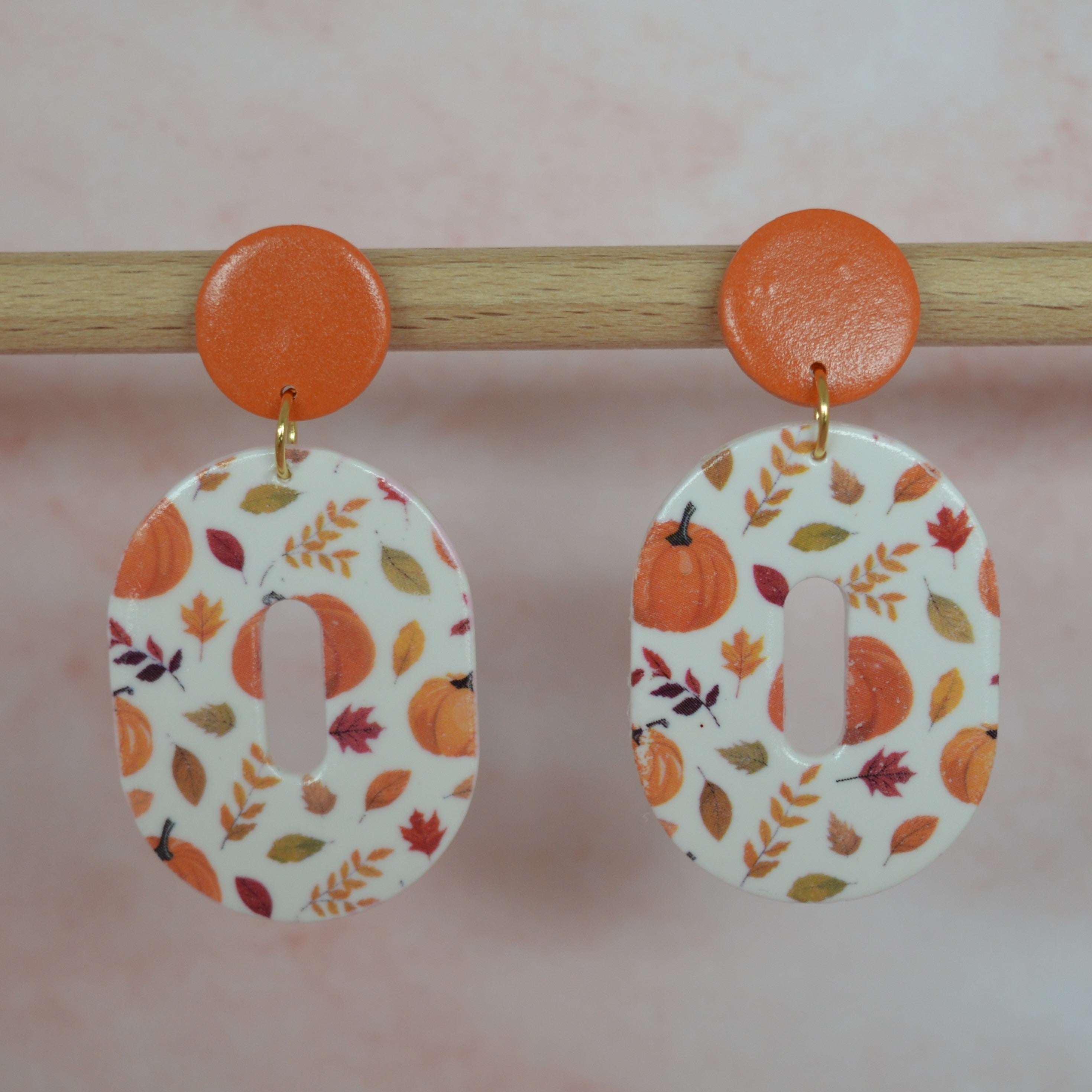 Een speelse ovalen vorm met subtiele uitsparing en een vrolijk herfstpatroon vol pompoenen en blaadjes. Licht in gewicht maar vol karakter โ perfect om je outfit instant die cozy pumpkin season vibe te geven. ๐๐