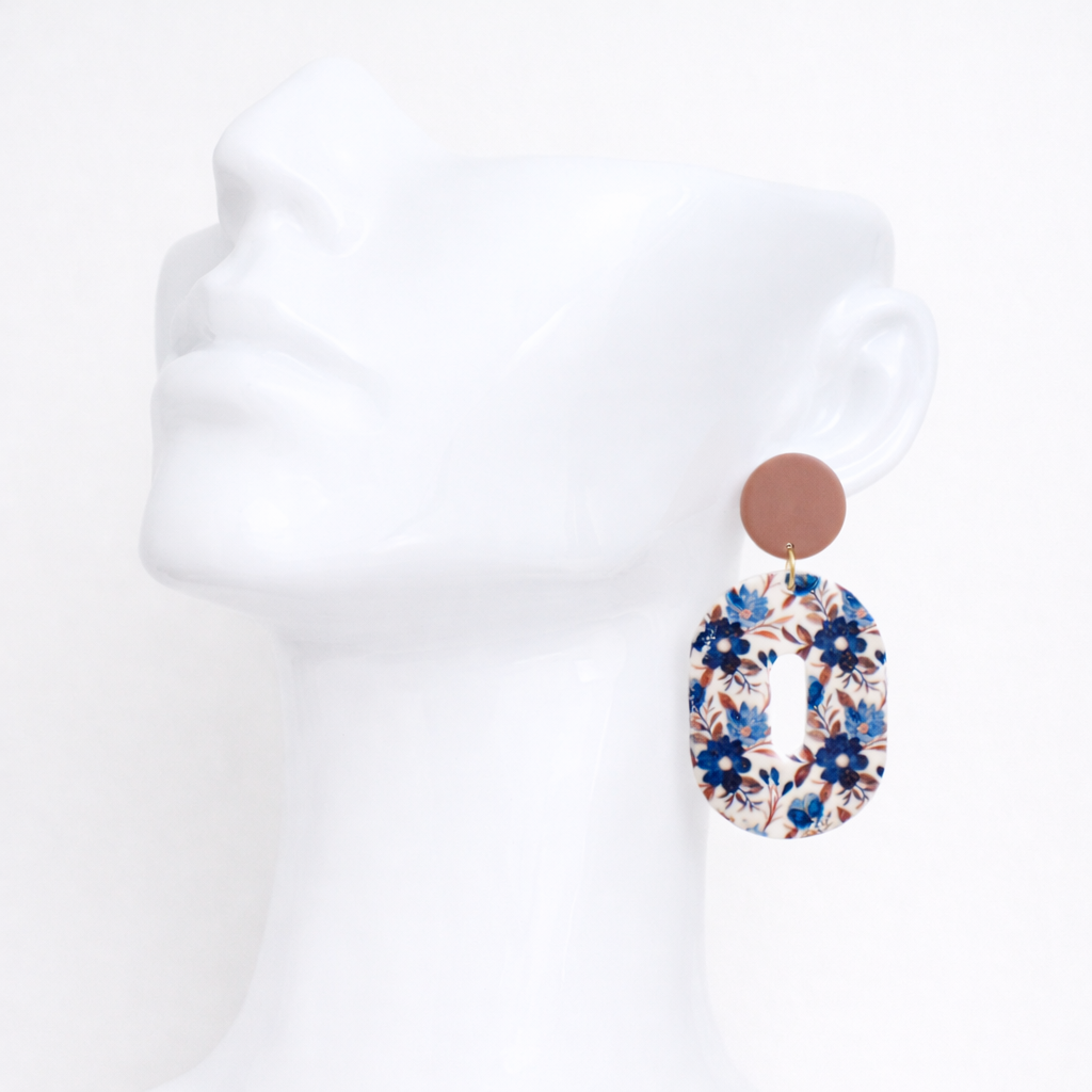 Loop Drop - Dark Blue Flower combineert een speelse open vorm met een verfijnd bloemenpatroon in diepe blauwtinten. De warme, subtiele stud bovenaan zorgt voor een mooi contrast en laat de florale print extra stralen. Licht om te dragen en perfect om elke outfit een elegante, vrouwelijke touch te geven - van casual tot gekleed.