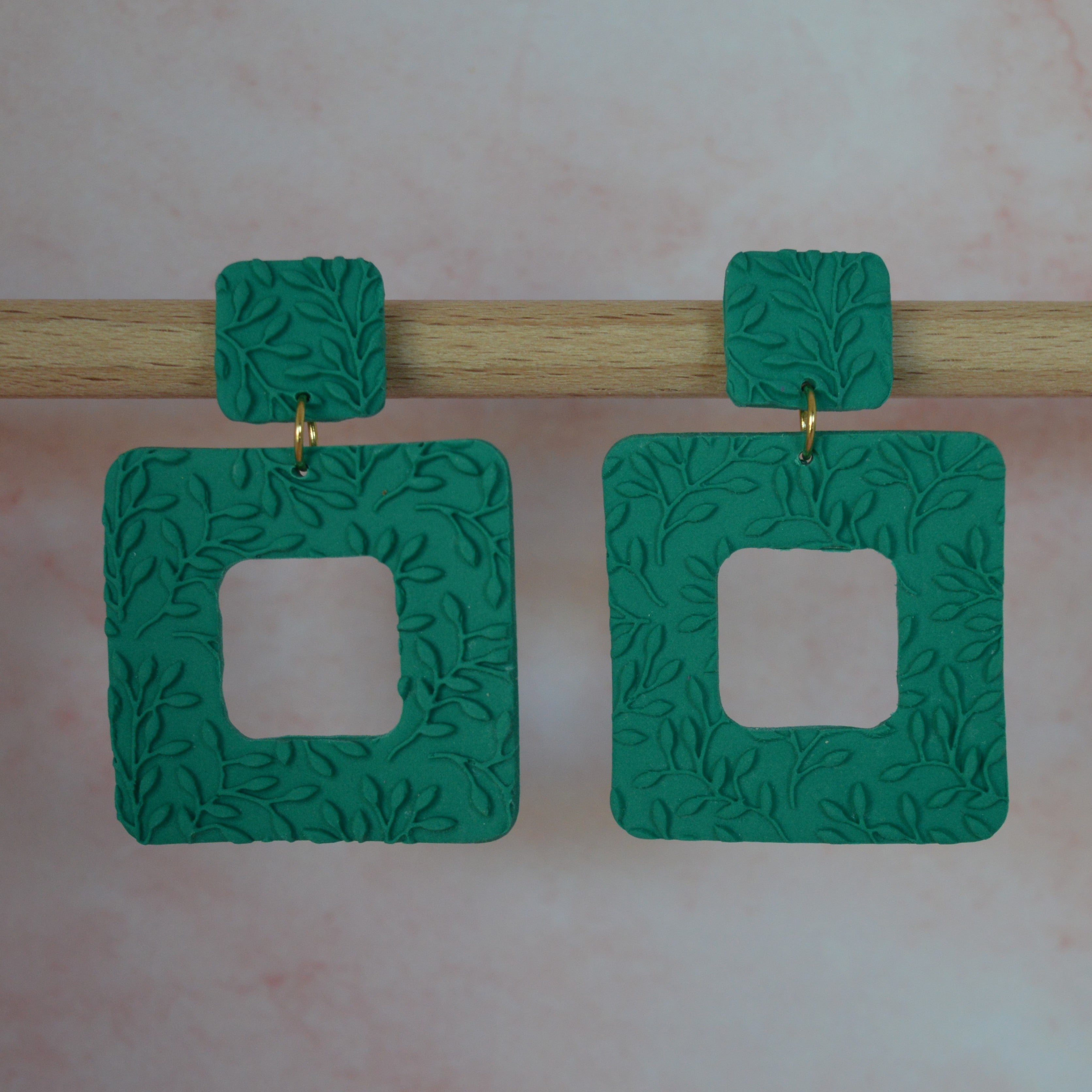 Deze handgemaakte oorbellen combineren strakke geometrie met een subtiel bladreliëf. Het diepe groen en de unieke vorm geven een stijlvolle, tijdloze uitstraling – perfect om elke look een vleugje elegantie te geven.