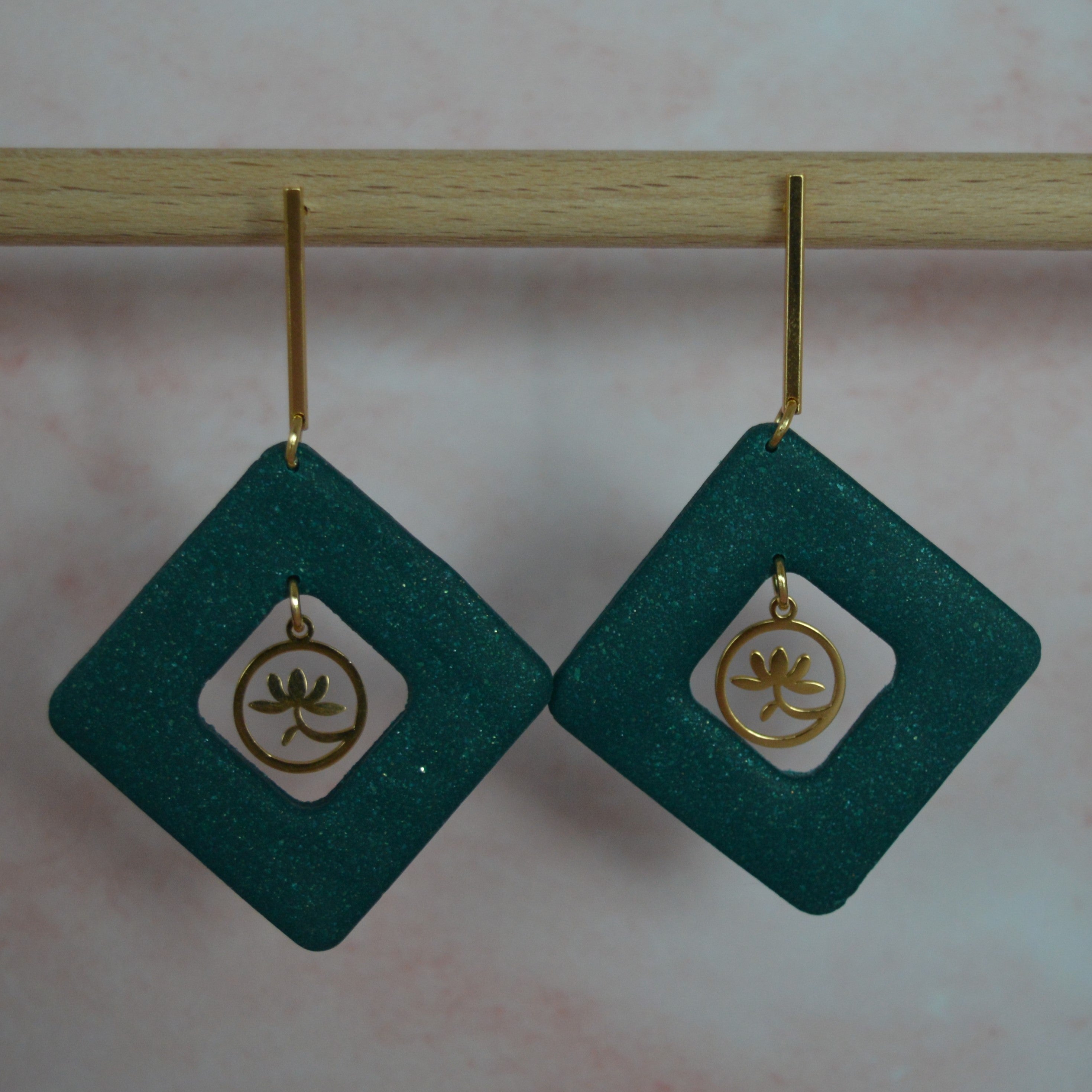 Deze handgemaakte oorbellen stralen rust en elegantie uit door hun geometrische vorm en subtiele lotusdetail. Het samenspel van diepe kleurtonen en gouden accenten maakt ze tot een tijdloze eyecatcher, perfect voor zowel dagelijks gebruik als bijzondere gelegenheden.