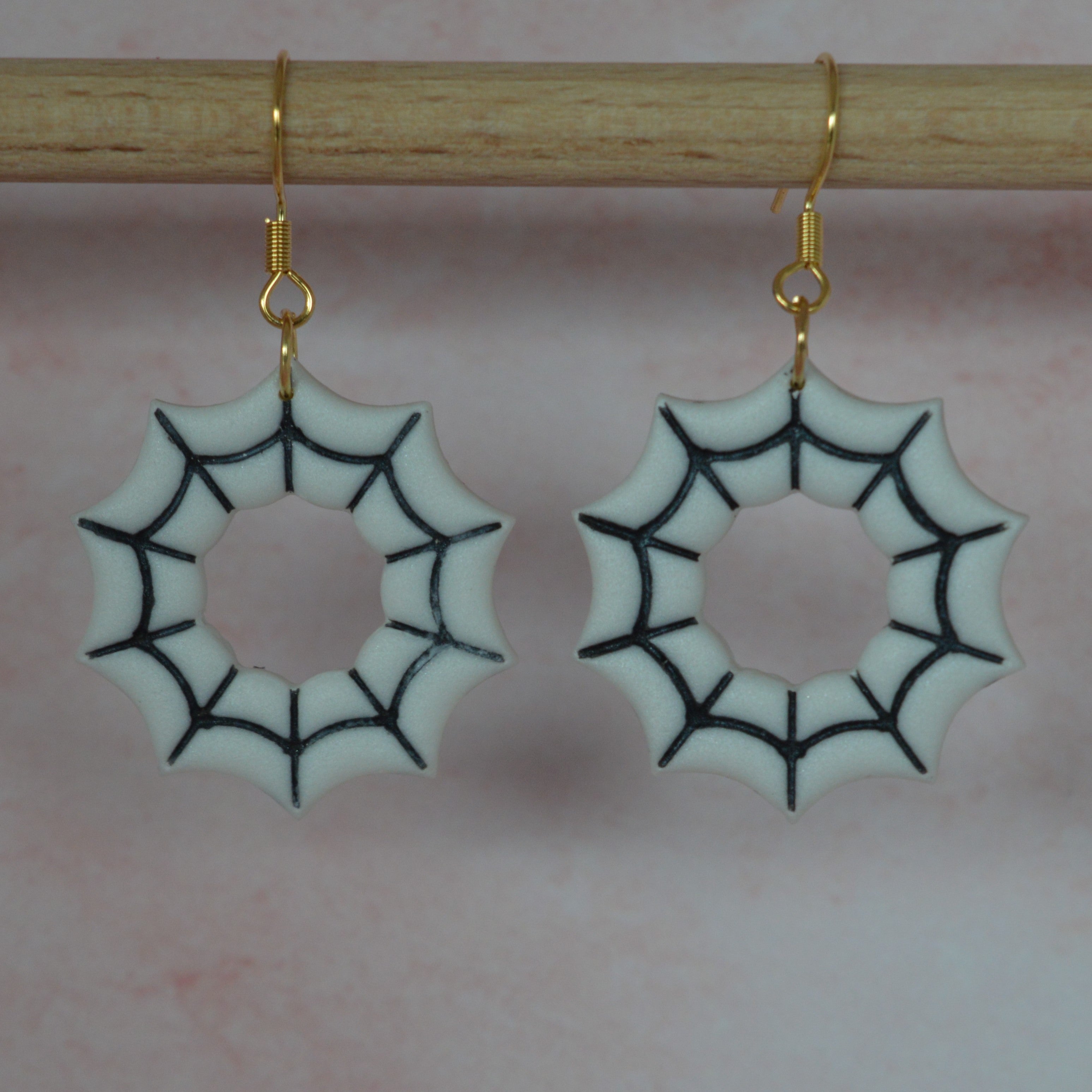 Laat je betoveren door deze unieke oorbellen die geïnspireerd zijn op het mysterieuze patroon van een spinnenweb. Perfect voor een speelse en spookachtige toets, maar toch elegant genoeg om elke outfit te versterken. Ideaal voor wie van originele en handgemaakte details houdt.