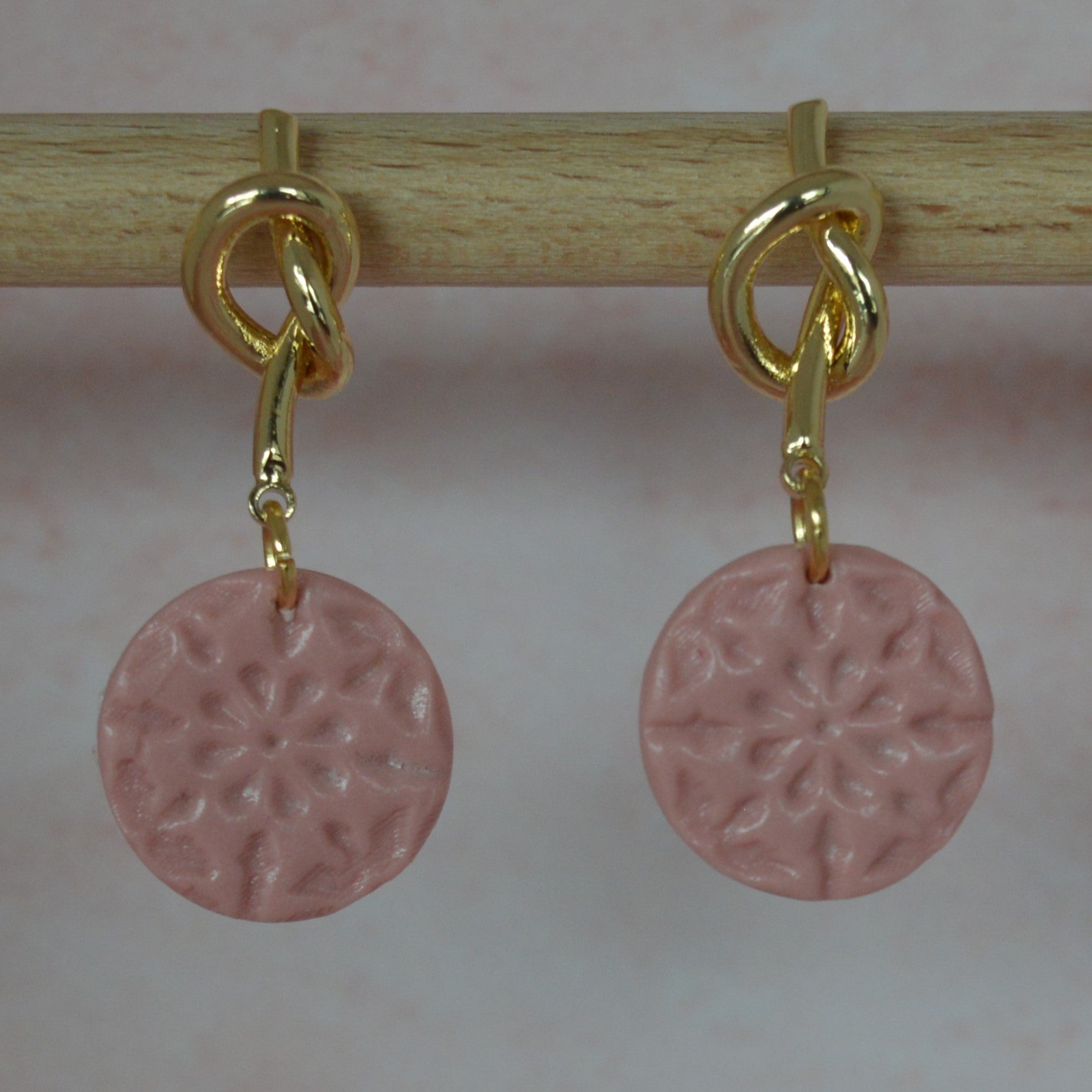 Deze handgemaakte oorbellen combineren een verfijnd reliëf met een elegante gouden knoop. Tijdloos en stijlvol, ontworpen om moeiteloos een vleugje klasse toe te voegen aan elke gelegenheid.